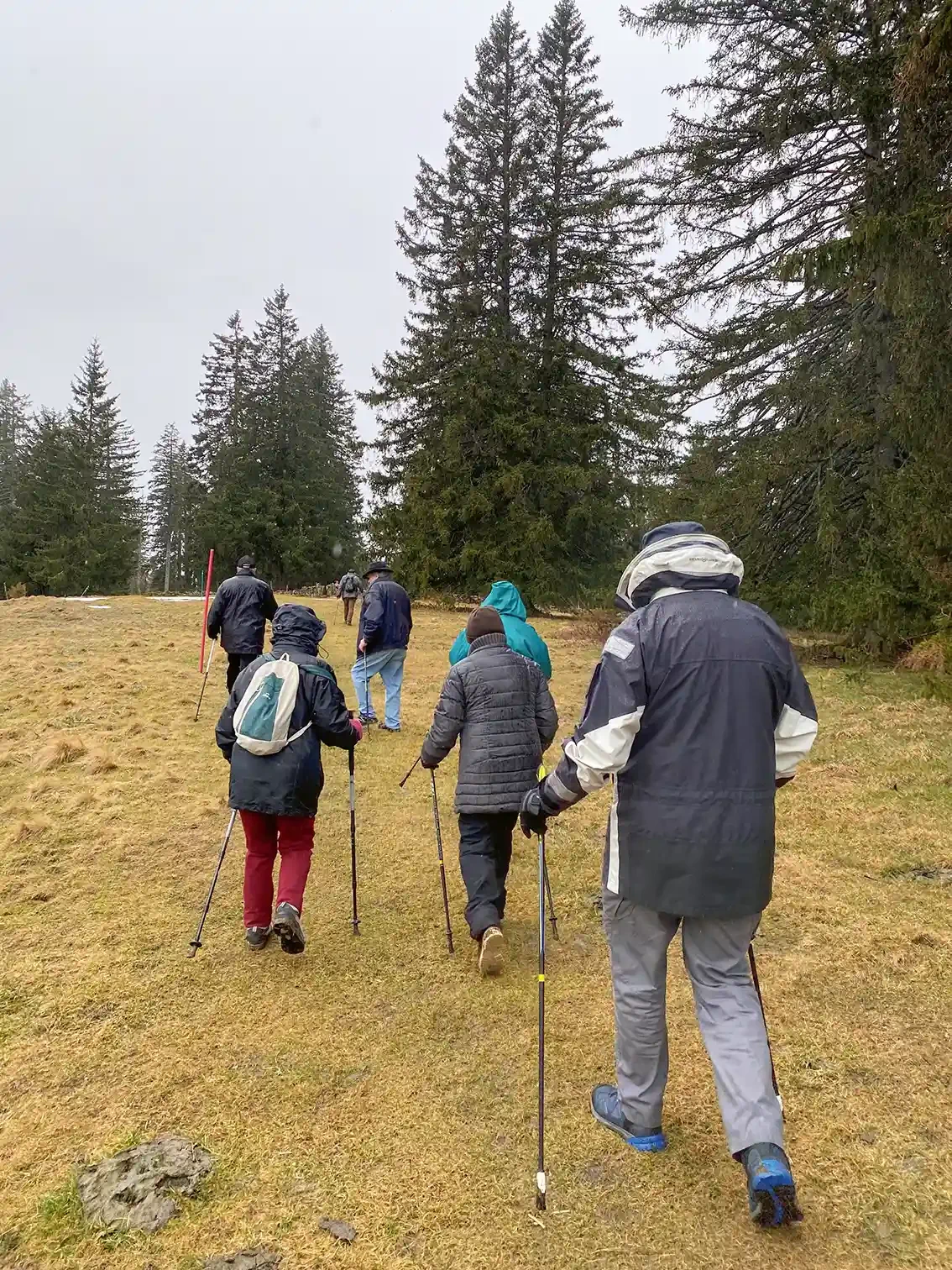 Sind die Romands härter im Nehmen als die Deutschschweizer? Oder warum hat bei diesem Wetter von den 46 Teilnehmenden – darunter 12 Angehörige – niemand abgesagt? Ausgerüstet mit Regenschutz und Wanderstöcken versammelt sich die fröhliche Gruppe oberhalb von La Chaux-de-Fonds. Die Wiedersehensfreude ist gross, viele kennen sich. Angeregt plaudernd machen sich die Seniorinnen und Senioren unter der Leitung von Mégane Fuchs und Fabio Esteves auf den Weg. Weder Regen noch Schlamm scheint sie zu beeindrucken. Manche marschieren zügig voraus, andere nehmen es gemütlich.