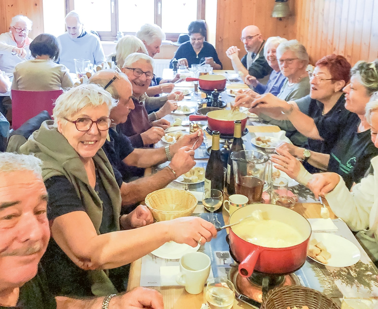 Mit von Schlamm strotzenden Schuhen treffen mittags alle gutgelaunt in der Buvette ein. Man ist sich einig: «Dieses Fondue haben wir uns verdient!» Über Krankheiten wird am Tisch nicht gesprochen. Es wird viel gelacht, man neckt sich und geniesst die Geselligkeit. Auch Claudine ist heute in ihrem Element: «Diese Ausflüge sind wunderbar! Mein Mann hat eines Tages erwähnt, dass ich als Angehörige auch mitmachen kann. Also habe ich ihn begleitet – und war sofort begeistert. Ich liebe es, unter Menschen zu sein. Es macht mir zudem Freude, diejenigen zu unterstützen, die nicht mehr so gut zu Fuss sind. Die Lungenliga Neuchâtel bietet weitere Aktivitäten, von denen ich als Angehörige profitiere. Ich gehe zum Beispiel regelmässig dort ins Fitness. Die Angebote beleben unseren Alltag, sogar unsere Beziehung. Wenn wir unabhängig voneinander etwas unternehmen, haben wir uns abends etwas zu erzählen», schmunzelt sie.